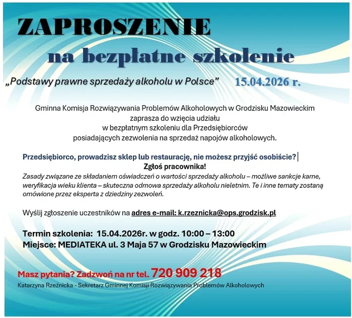 W Grodzisku Mazowieckim pojawia się propozycja dla tych, którzy na co dzień pracują z alkoholem albo odpowiadają za jego sprzedaż. Gminna Komisja Rozwiązywania Problemów Alkoholowych zaprasza na bezpłatne szkolenie poświęcone podstawom prawnym sprzedaży alkoholu w Polsce. To temat, który zwykle wraca dopiero przy problemach, a tym razem można go uporządkować wcześniej.