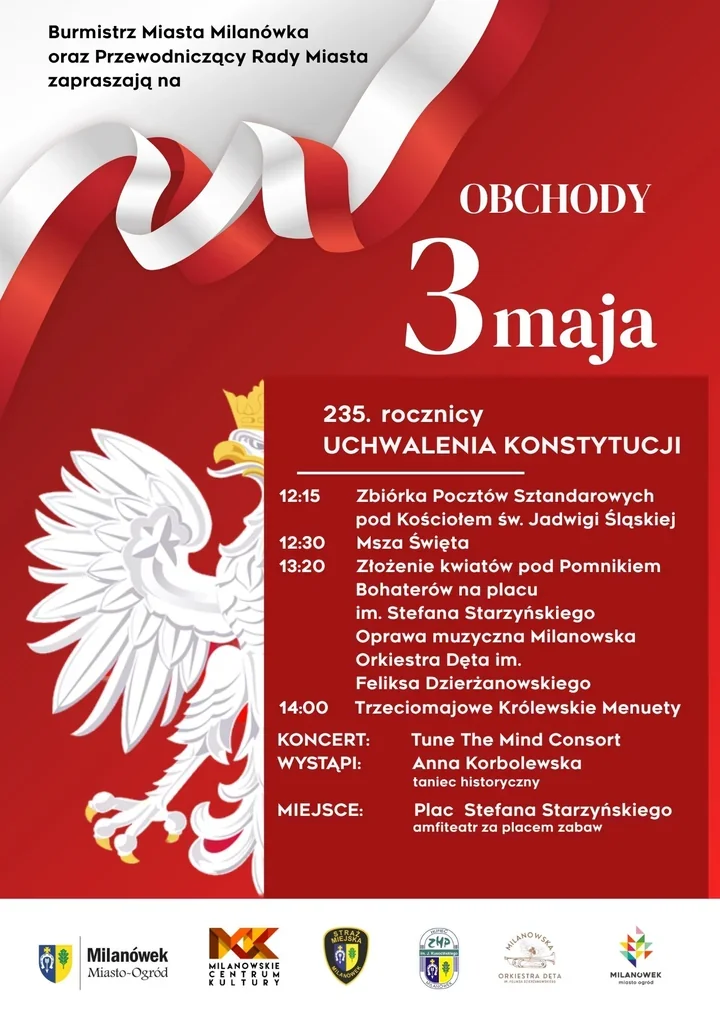 W Milanówku trzeciomajowe obchody zaczną się od wspólnego spotkania przed kościołem św. Jadwigi Śląskiej, a zakończą przy dźwiękach historycznego koncertu. W programie są msza, złożenie kwiatów pod Pomnikiem Bohaterów i muzyczne popołudnie w amfiteatrze za placem zabaw na placu Stefana Starzyńskiego. To święto ma tu wyraźny rytm – podniosły, ale bliski mieszkańcom.
