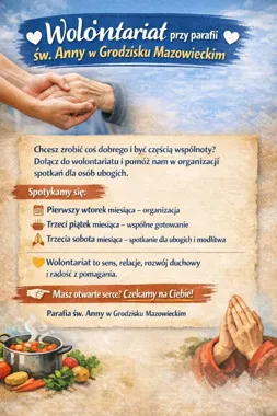 Dla kogo? Dla osób chcących pomagać lokalnie, tych, którzy już działają w grupie, i tych, którzy dopiero zastanawiają się nad zaangażowaniem. Przyjdź po Mszy — atmosfera nieformalna, kawa i rozmowy.