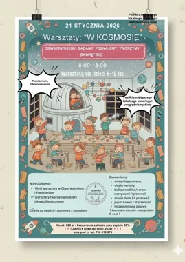 Dzień zaczyna się od praktycznych warsztatów „W kosmosie”, podczas których uczestnicy będą mogli poznać podstawy tematów astronomicznych i wziąć udział w aktywnych ćwiczeniach. Jako ekstra bonus organizatorzy przygotowali pokaz filmowy w Planetarium — połączenie teorii i spektakularnej wizualizacji.