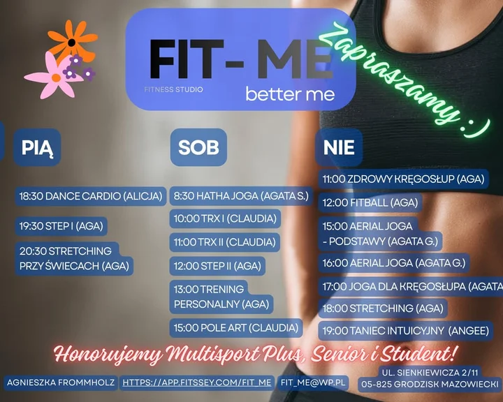 - Wstęp i zapisy: nie podano ceny ani informacji o biletach; zapisy odbywają się w systemie rezerwacji Fit_Me